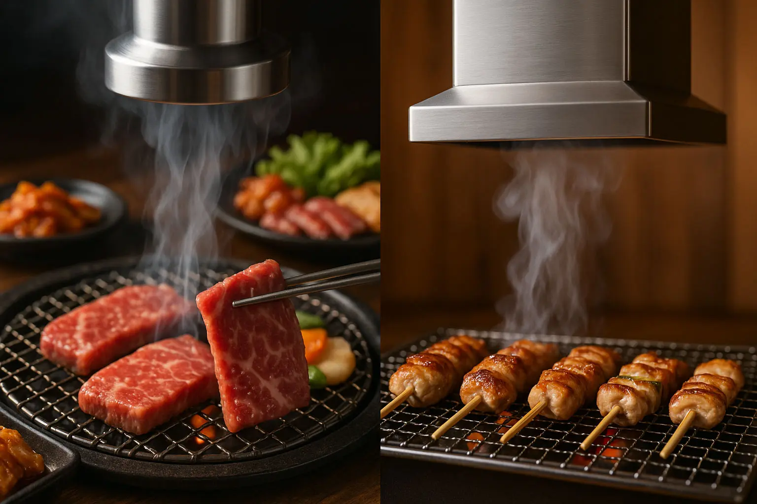 焼肉店や下引き/上引きダクトの無煙ロースタでは、火の付いた油や炎がダクトに吸い込まれ、内部に堆積した油かすに着火して延焼する事例が報告されています。厨房内からダクトへ延焼したケースや、オーブンや排気部からの発煙を起点とした事例も公表されています。これらは「ダクト内の油脂堆積」と「可燃性残渣への着火」が共通の要因です。