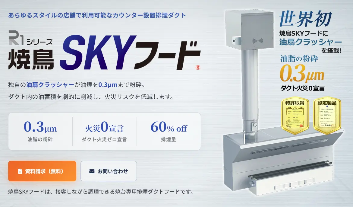 カウンター設置が可能な「焼鳥SKYフード」は、油の蓄積を抑えて安全性を高めるだけでなく、快適な接客環境も実現します。あらゆるスタイルの店舗に対応するカウンター設置排煙ダクトはこちらから。https://nodahappy.jp/skyhood/